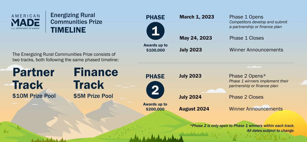 The Energizing Rural Communities Prize is structured in two phases. Phase One will award $100,000 to up to 90 awardees. Those awardees are eligible to apply by July 2024 to compete for an additional $200,000 in Phase Two.